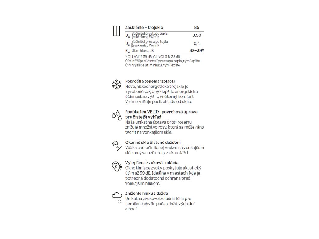 - Nové trojvrstvové zasklenie (85) prináša špičkovú tepelnú izoláciu a výnimočnú redukciu hluku: pokročilá tepelnú izoláciu, vylepšená zvuková izolácia, zníženie hluku z dažďa, samočistiacu vrstvu a vrstvu proti roseniu